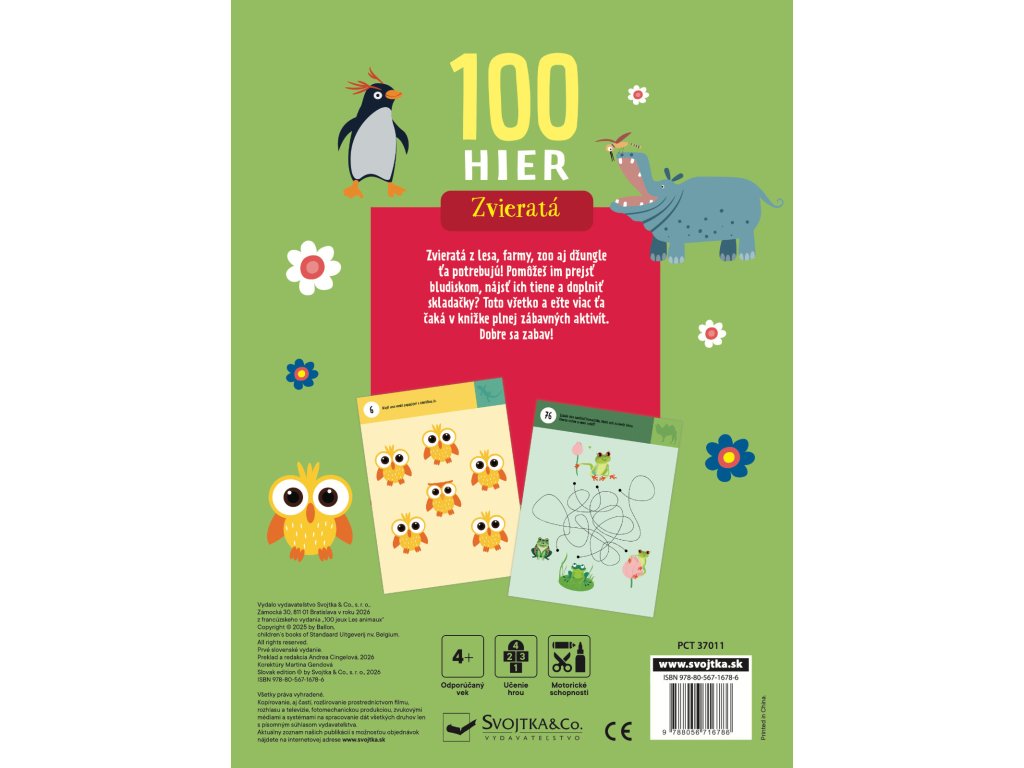 Kniha je plná zvieratiek a krátkych hier, pri ktorých sa deti zabavia naozaj na dlho. Obsahuje 100 hier určených predovšetkým pre štvorročné deti. Podnecuje logické myslenie, riešenie problémov, predstavivosť aj tvorivosť. Pri plnení úloh si deti precvičujú písanie, postreh, koordináciu oka a ruky aj motorické schopnosti. Deti budú dokresľovať obrázky, obťahovať línie, hľadať rozdiely či prechádzať bludiskami. Úlohy prispôsobené veku malých predškolákov ich nielen rozvíjajú, ale aj zabavia.Dodatočné parametre