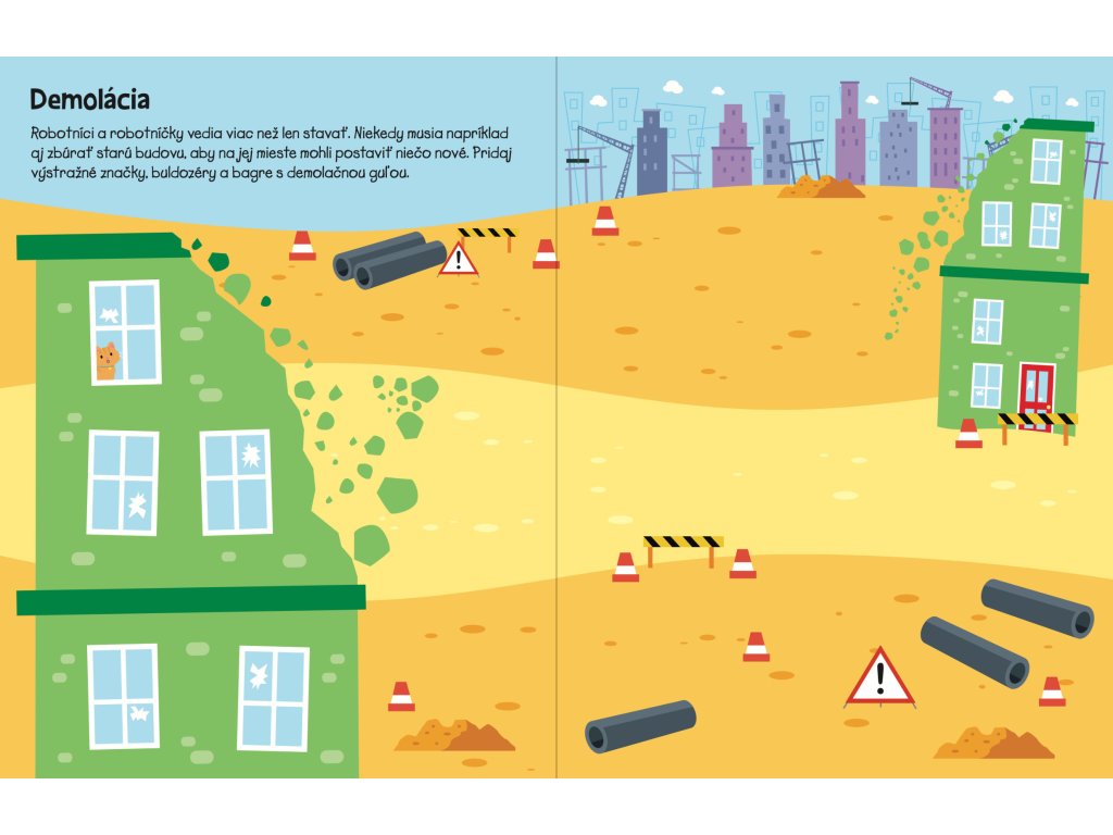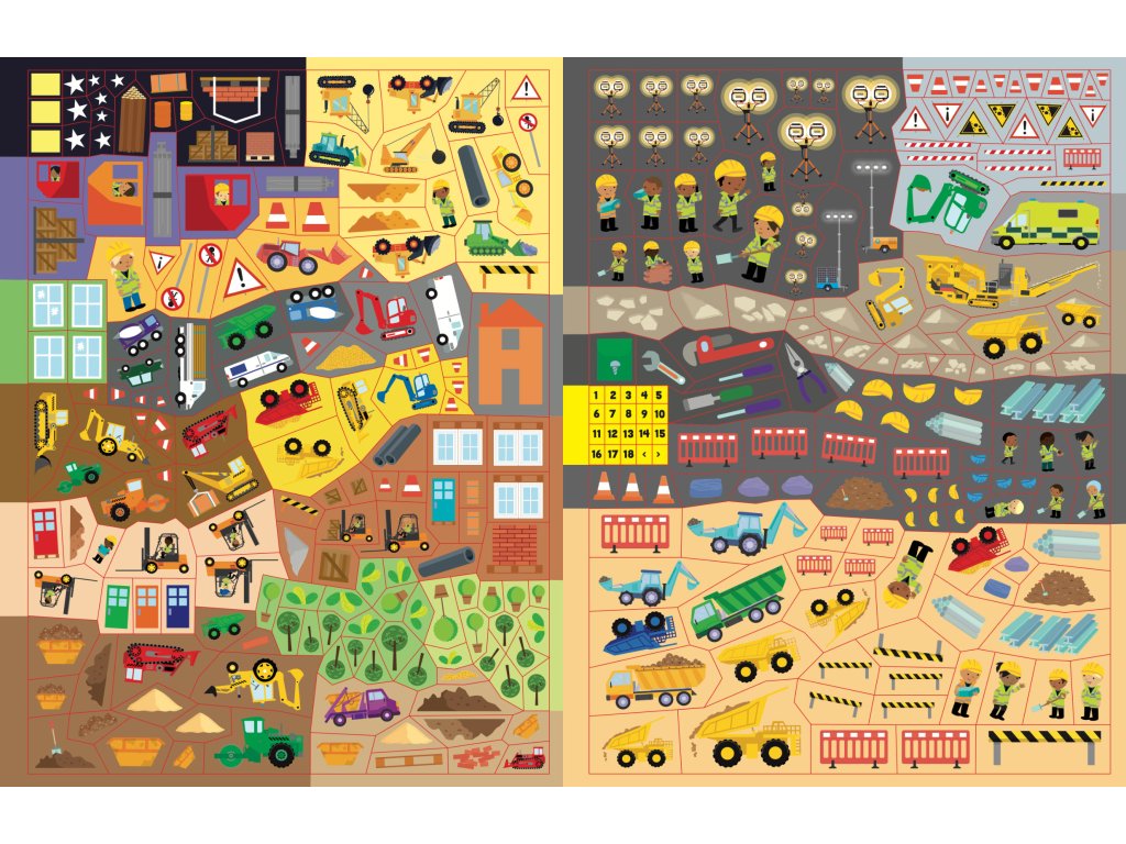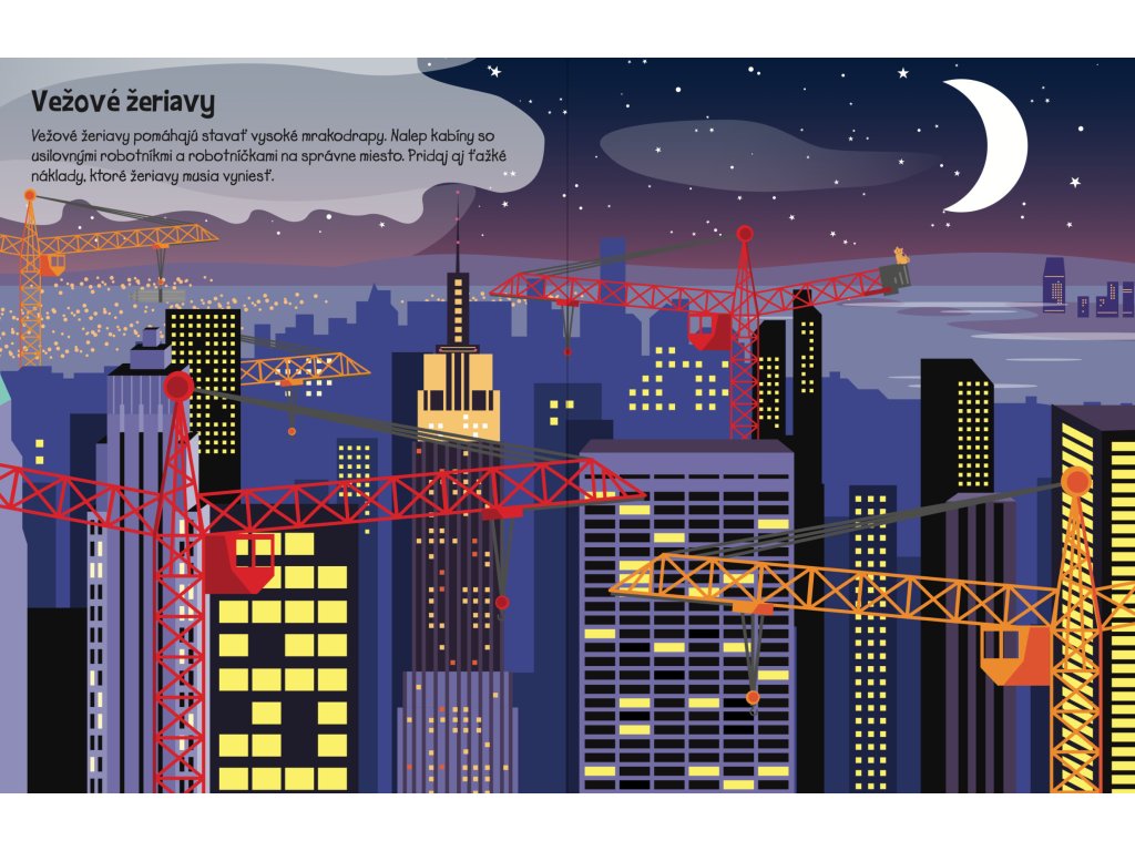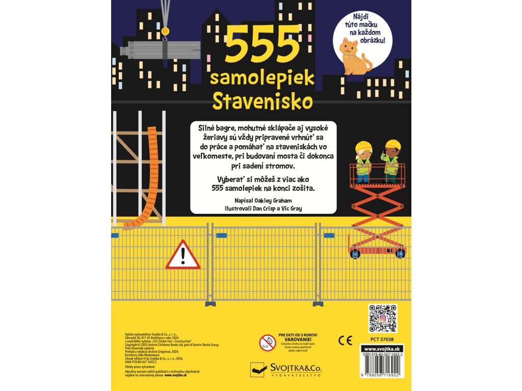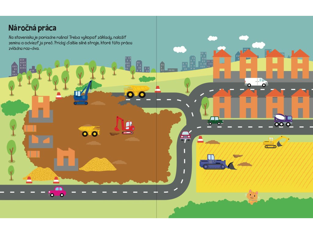 Viac ako 555 samolepiek čaká na teba a tvoju predstavivosť v tomto úžasnom zošite! Silné bagre, plné vyklápače i vysoké žeriavy sú vždy pripravené vrhnúť sa do práce a pomoci na staveniskách vo veľkomeste, pri výstavbe mostu či pri sadení stromov. Dopĺňaj podľa vlastnej fantázie nespočetné množstvo samolepiek do nápaditých a rušných scenérií s najrôznejšími typmi stavenísk a spoznaj množstvo stavebných strojov.Dodatočné parametre