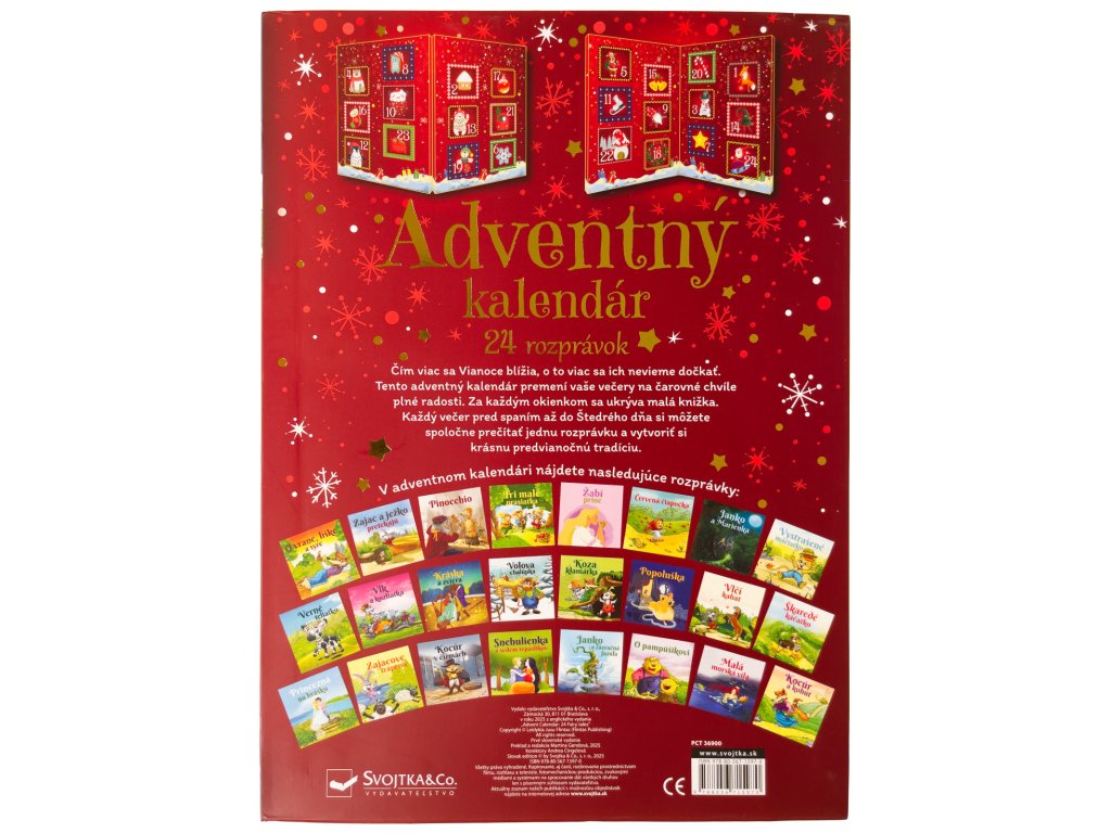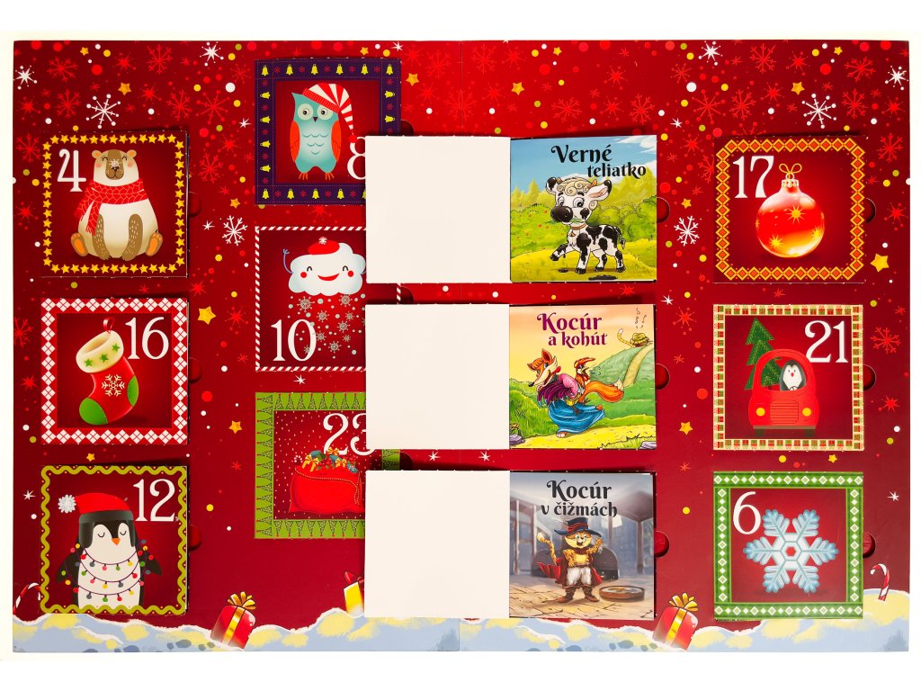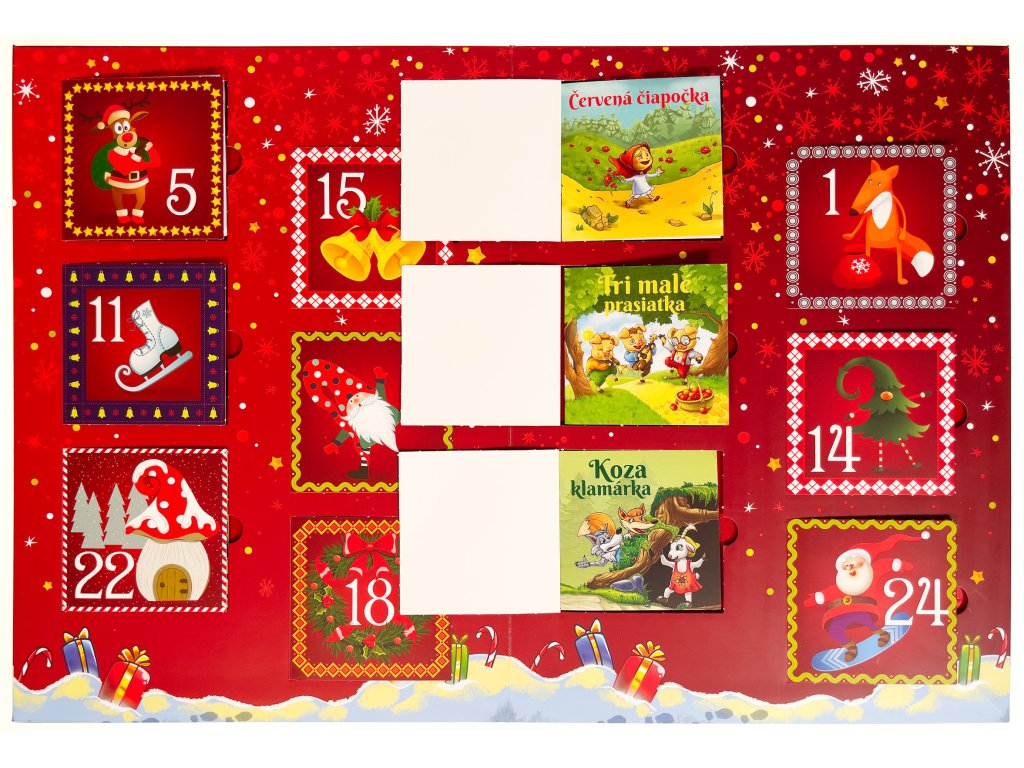 Čím viac sa blížia Vianoce, tým skôr sa ich nemôžeme dočkať. Premeňte dlhé večery plné očakávania na radostné a kúzelné chvíle. Za okienkami tohto adventného kalendára sa ukrývajú malé knižky. Každý večer pred spaním po celý december až do Štedrého dňa si môžete spoločne prečítať jednu rozprávku a vytvoriť si peknú rodinnú predvianočnú tradíciu. Vnútri kalendára nájdete 24 okienok so známymi rozprávkami, ako napríklad Škaredé káčatko, Popoluška, O pampúšikovi, Tri malé prasiatka, Vlk a kozliatka alebo Princezná na hrášku.Dodatočné parametre