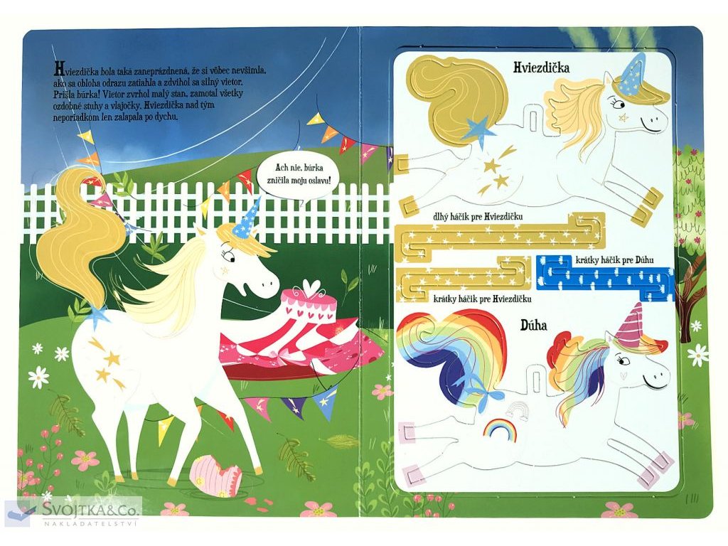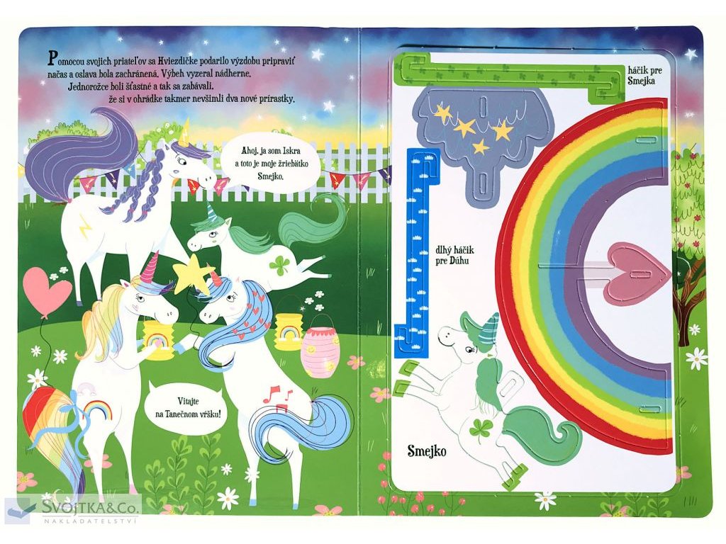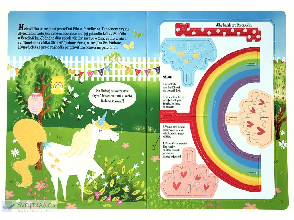 Vitaj na Tanečnom vŕšku, kde majú svoj výbeh jednorožce. Hviezdička a jej priatelia s radosťou očakávajú nové jednorožce, a tak pripravujú oslavu na privítanie. Hviezdička chce všetko zvládnuť sama, ale nevšimne si, že sa blíži búrka. Silný vietor zborí stan a zničí výzdobu. Úbohá Hviezdička. Ostatné jednorožce sa smutnej Hviezdičke ponáhľajú na pomoc a spoločnými silami i pomocou kúziel stihnú výbeh pripraviť práve včas. Prichádza totiž Iskra a jej žriebätko Smejko. Kniha je ideálna na predčítanie malým dievčatkám, ktoré fascinuje čarovný svet jednorožcov. Obsahuje ľahko zostaviteľný model závesného kolotoča, ktorý svojmu dieťaťu môžete pripnúť nad postieľku. Nožnice ani lepidlo potrebovať nebudete, diely stačí jednoducho vycvaknúť zo stránok a zasunúť do seba. A tak bude mať vaše dieťa obľúbené čarovné jednorožce stále pri sebe!