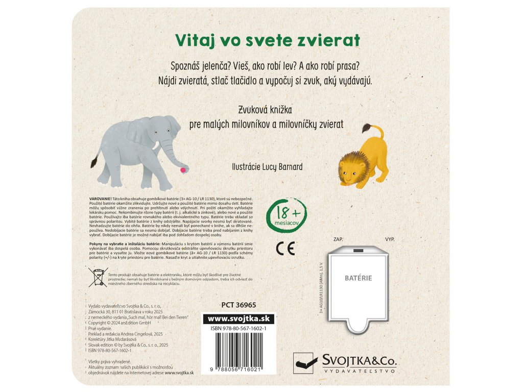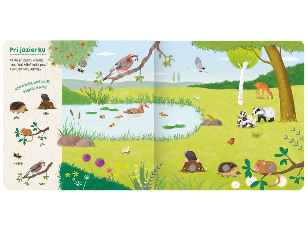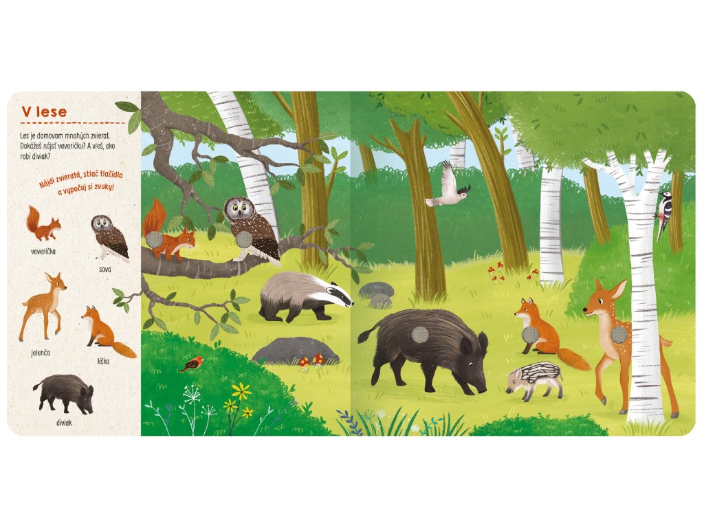 Vitaj vo svete zvierat. Poznáš jelenča? Vieš, ako robí lev? A ako prasa? Hľadaj a spoznávaj zvieratá v tejto zvukovej knihe s pevnými stránkami v rôznych prostrediach. Nájdi zvieratá, stlač tlačidlo a vypočuj si zvuk, aký vydávajú. Táto roztomilo ilustrovaná kniha predstaví deťom zvieratá v ich prirodzenom prostredí a naučí ich rozpoznávať podľa zvukov.Dodatočné parametre