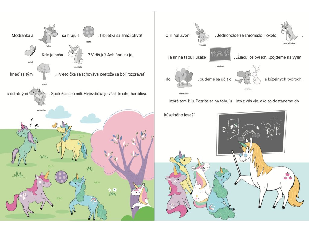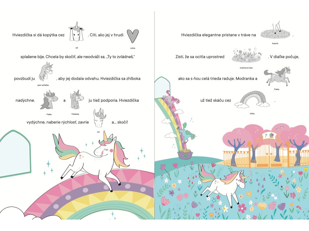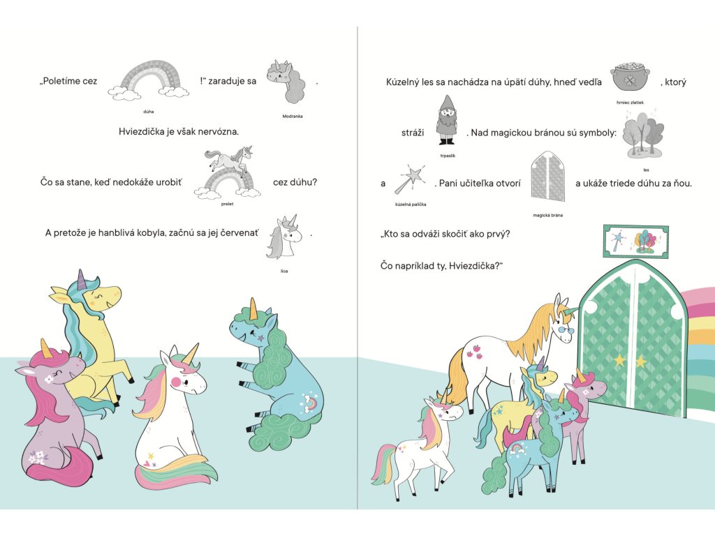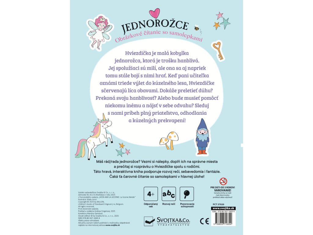 Obrázkové čítanie so samolepkami! Hviezdička je malá kobylka jednorožca, ktorá je trošku hanblivá. Jej spolužiaci sú milí, ale ona sa aj napriek tomu stále bojí s nimi hrať. Keď pani učiteľka oznámi triede výlet do kúzelného lesa, Hviezdičke sčervenajú líca obavami. Dokáže preletieť dúhu? Prekoná svoju hanblivosť? Alebo bude musieť pomôcť niekomu inému a nájsť odvahu v sebe? Sleduj s nami jej príbeh plný priateľstva, odhodlania a kúzelných prekvapení! Máte radi jednorožce? Vezmi si nálepky, doplň ich na správne miesta a prečítaj si rozprávku o Hviezdičke spolu s rodičmi. Táto hravá, interaktívna kniha podporuje rozvoj reči, sebavedomia i fantázie. Čaká ťa čarovné čítanie so samolepkami v hlavnej úlohe!Dodatočné parametre
