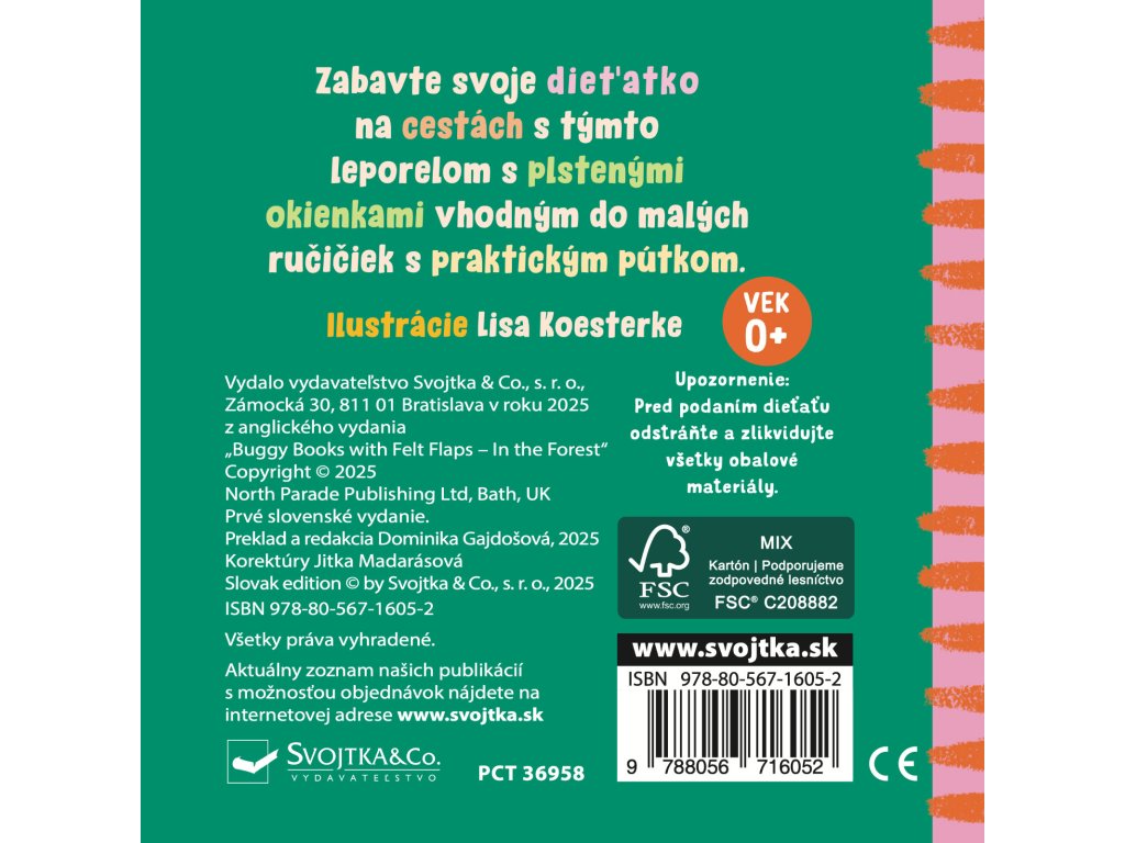 Táto menšia knižka s plstenými okienkami zaujme najmenšie deti. Vďaka vhodnej veľkosti a mäkkým okienkam leporelo pomôže s rozvojom zraku, hmatu i motorických schopností. Deti sa zoznámia so zvieratkami v lese a praktické pútko zaistí, že bábätko bude mať knižočku vždy po ruke.Dodatočné parametre