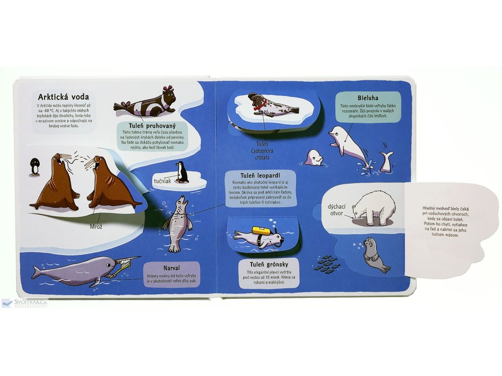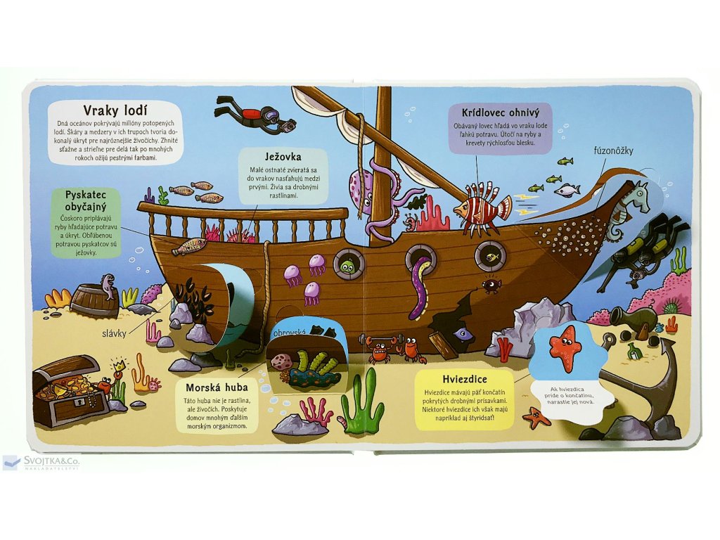Pozrite sa zblízka pod hladinu morí a oceánov! Pestrofarebné rybky prepletajúce sa koralovými útesmi, tajomné ryby z hlbín aj obrovské veľryby, tie všetky spoločne obývajú zdanlivo nekonečné moria a oceány. Preskúmajte obyvateľov potopených lodí, vydajte sa do ľadových arktických vôd a zoznámte sa s tými najväčšími, najrýchlejšími a najnebezpečnejšími tvormi s plutvami aj bez nich. Pod vyše 50 odklápacími okienkami na vás čaká množstvo zaujímavostí!