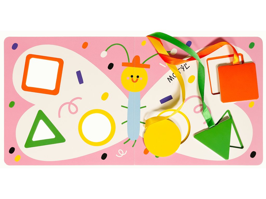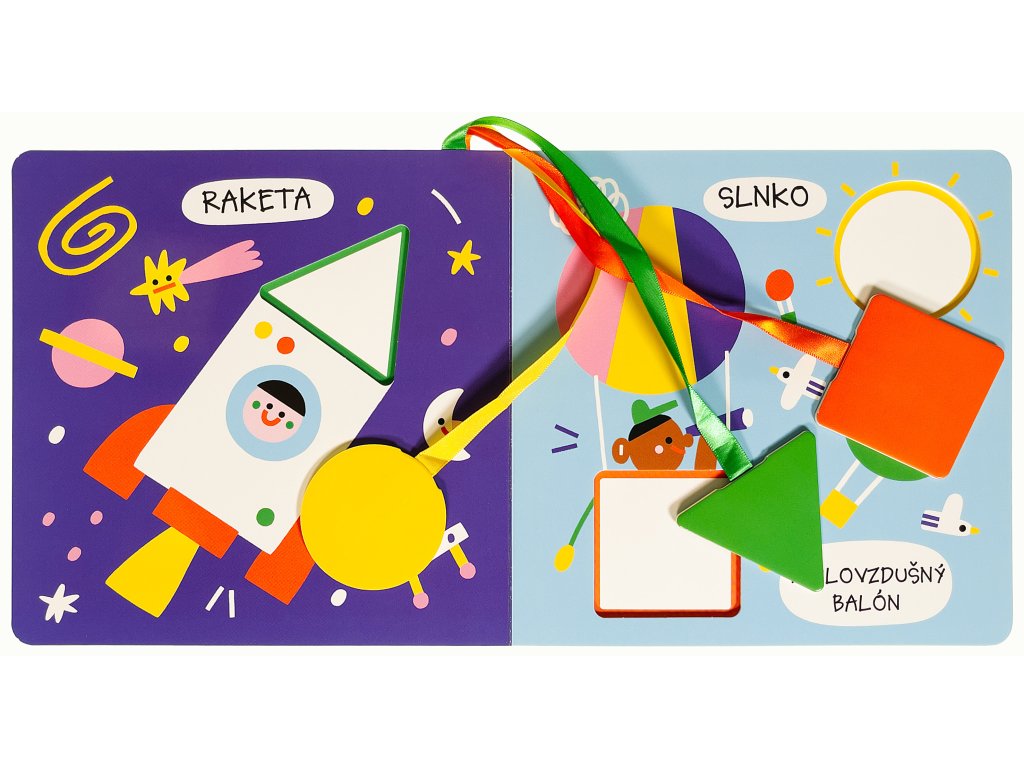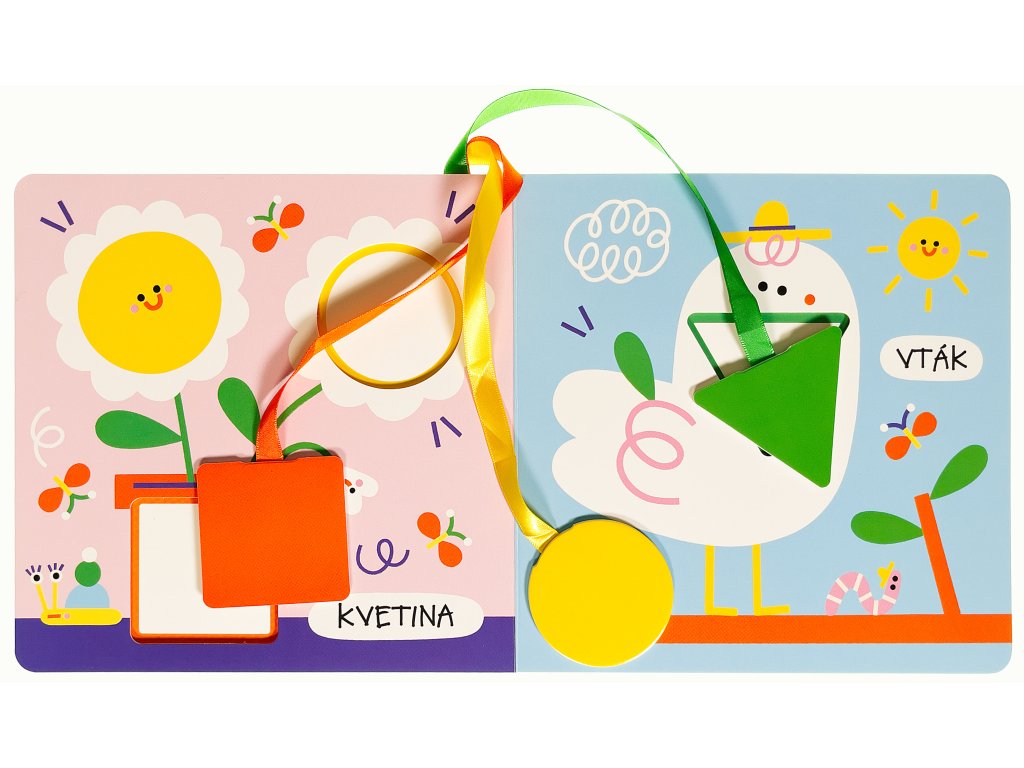 Leporelo, s ktorým je učenie tvarov a prvých slov jedna veľká farebná zábava! Deti hľadajú správne miesto na umiestnenie farebných tvarov - žltého kolieska, zeleného trojuholníka a oranžového štvorca - a vkladajú ich do výrezov v obrázkoch, čím ich dokončujú. Pomôžu tak ozdobiť motýlie krídlo, rakete nasadiť špičku či doplniť stred kvetiny. Tvary sú pevne pripevnené na farebných stuhách, takže sa nestratia a deti sa s nimi môžu hrať znova a znova. Okrem precvičovania jemnej motoriky a logického myslenia sa deti na stránkach zoznámia aj s prvými jednoduchými slovami. Veselé ilustrácie poľskej výtvarníčky Susie Hammer robia z tejto knihy ideálne prvé leporelo na spoznávanie tvarov a rozvoj slovnej zásoby už od 1 roka.