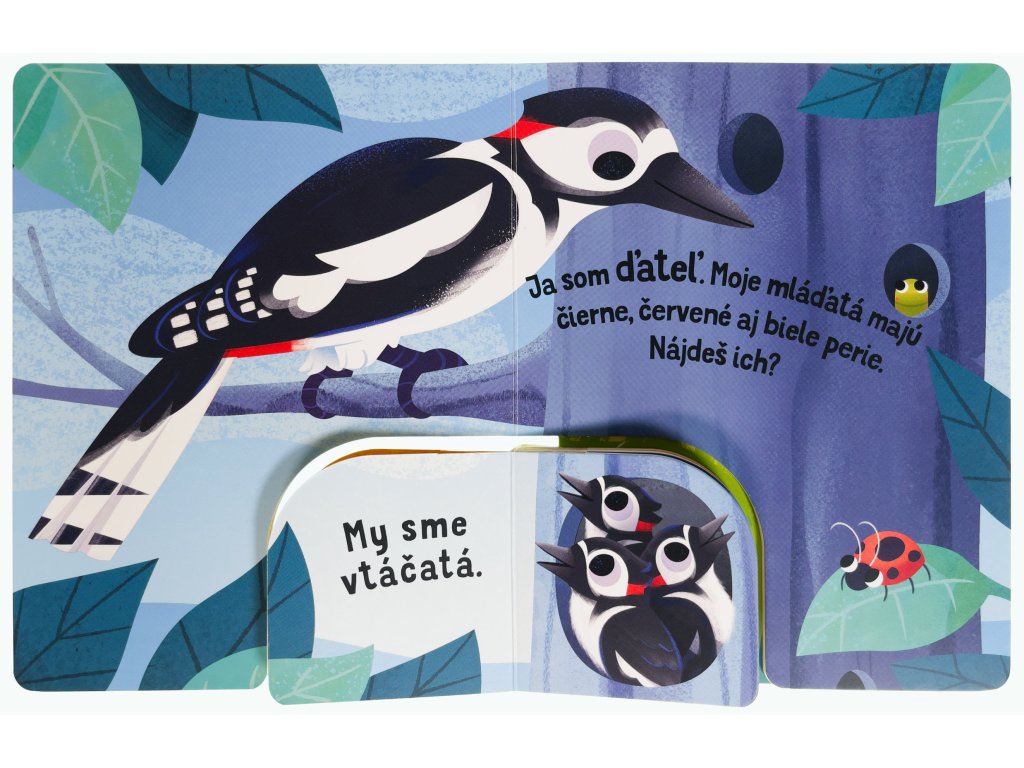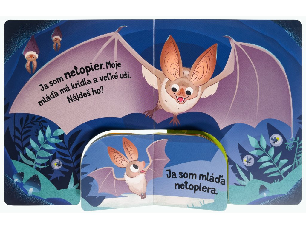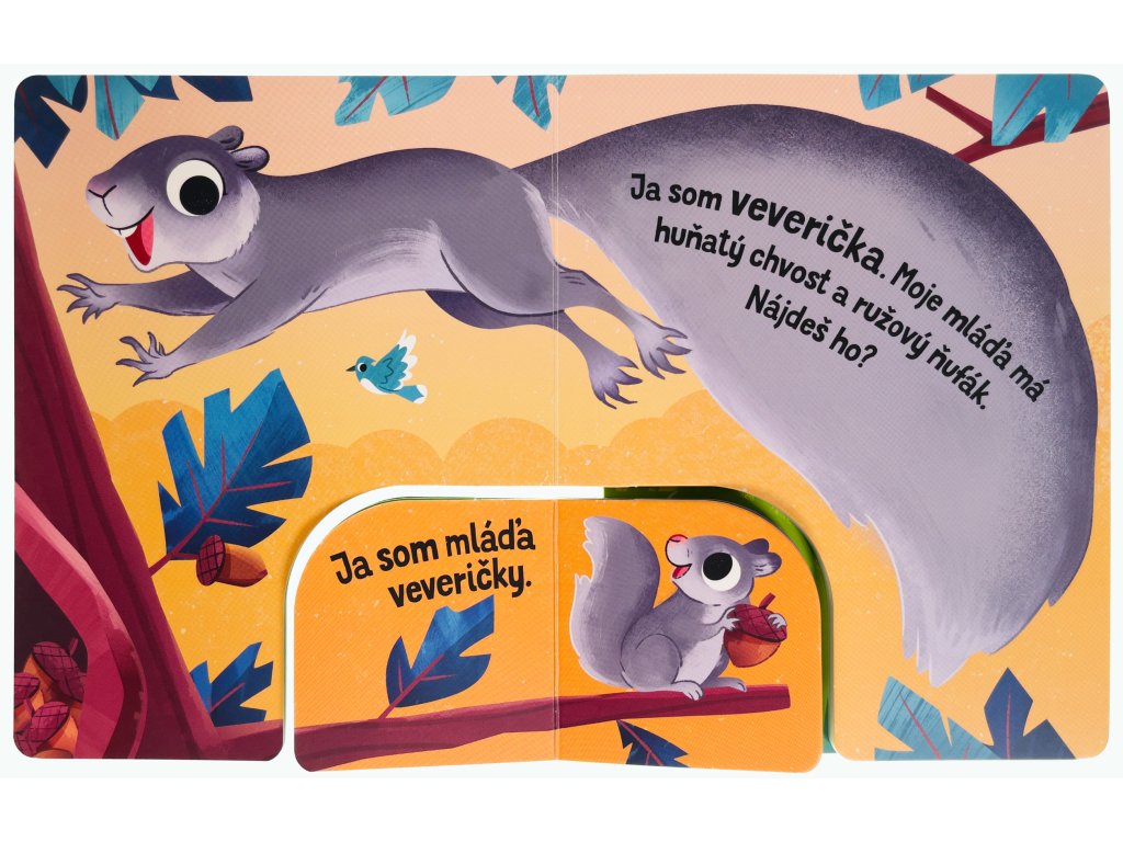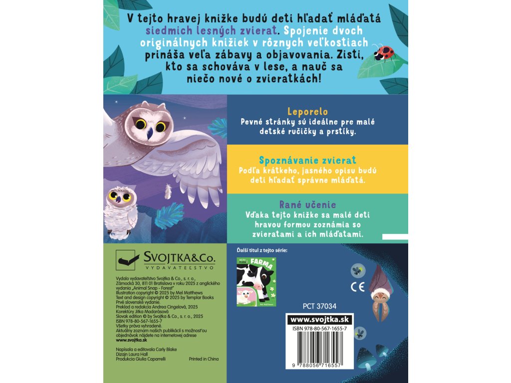 V tomto originálne spracovanom leporele čaká na deti zábava aj spoznávanie. Vďaka prepojení dvoch leporel rôznych veľkostí budú deti na základe jasného a krátkeho popisu hľadať správne mláďatá zvierat z lesa. Pevné stránky sú ideálne pre malé ručičky a robia z tejto knihy perfektného spoločníka na jedno z prvých zoznámení sa so svetom zvierat. Malé deti si precvičia jemnú motoriku a pršteky, spoznajú prvé slovíčka a zoznámia sa so zvieratami a ich mláďatami.Nájdi mláďa Les