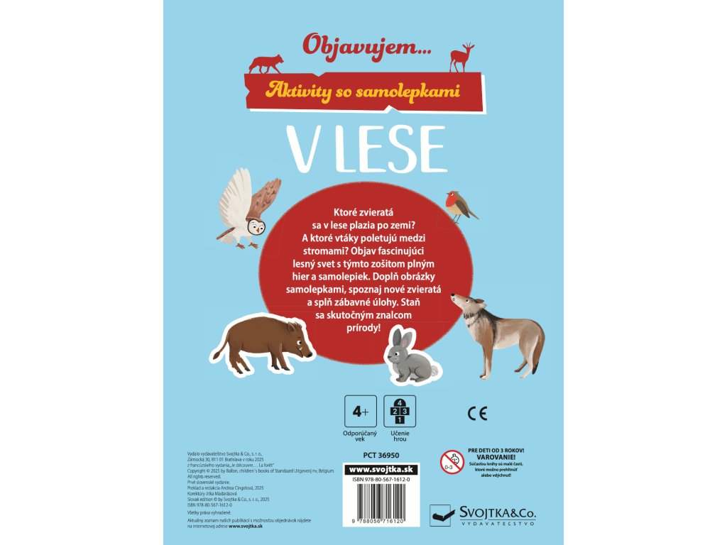 S týmto zošitom plným zábavných hier a samolepiek sa dozvieš mnoho informácií o lese. Zisti, ktoré zo zvierat v lese sa plazia po zemi a ktoré vtáky poletujú po lese. Dolepuj do obrázkov samolepky, spoznaj nové zvieratá a splň zábavné úlohy. Bude z teba naozajstný znalec prírody! Obsahuje znovu použiteľné samolepky.Dodatočné parametre