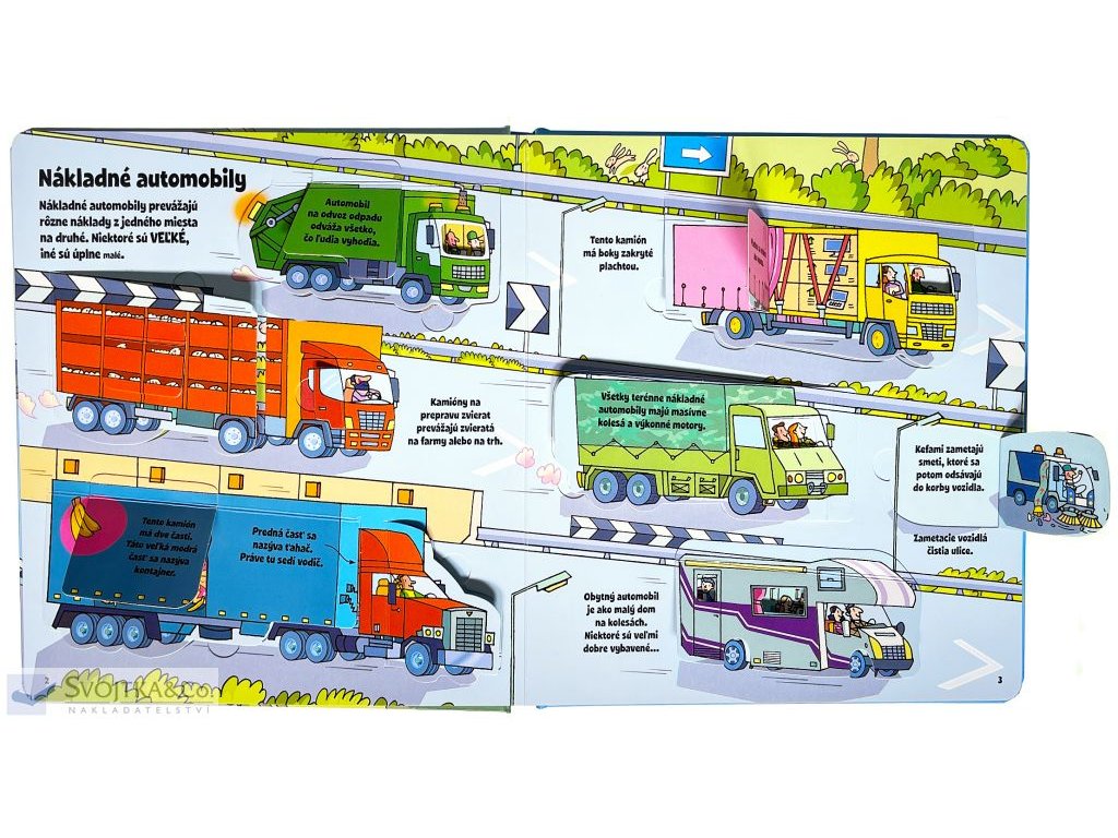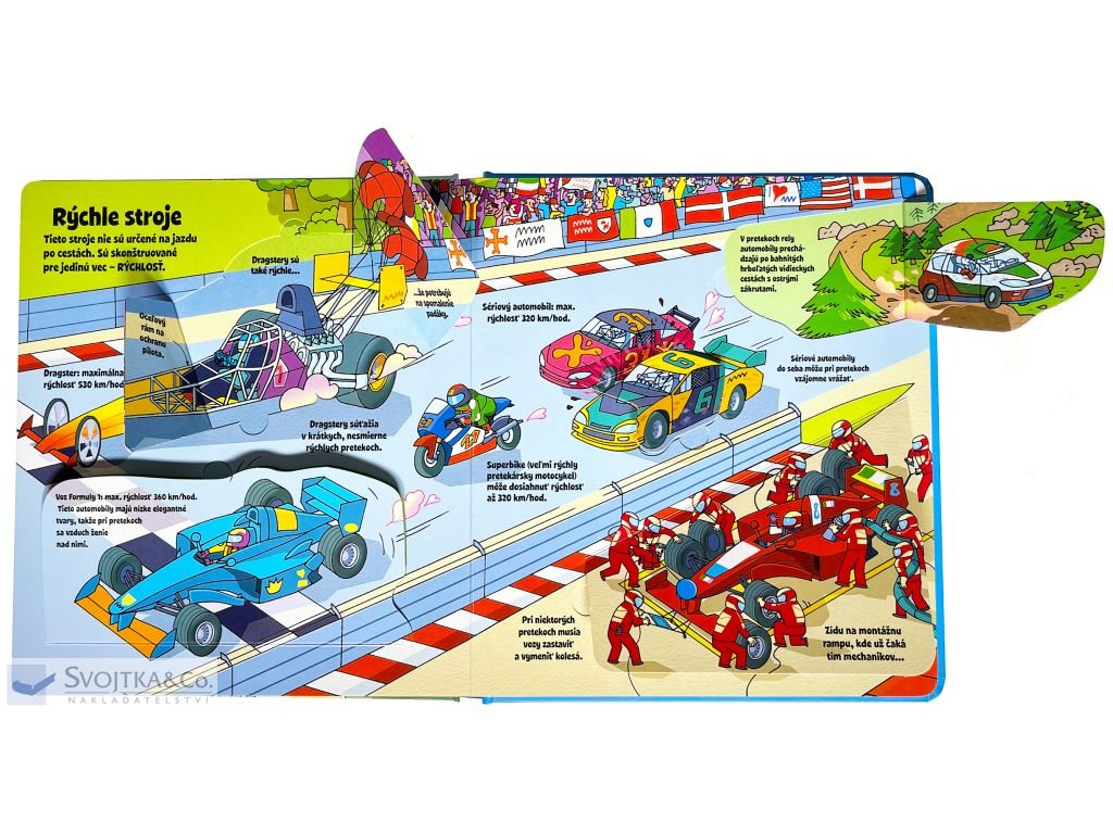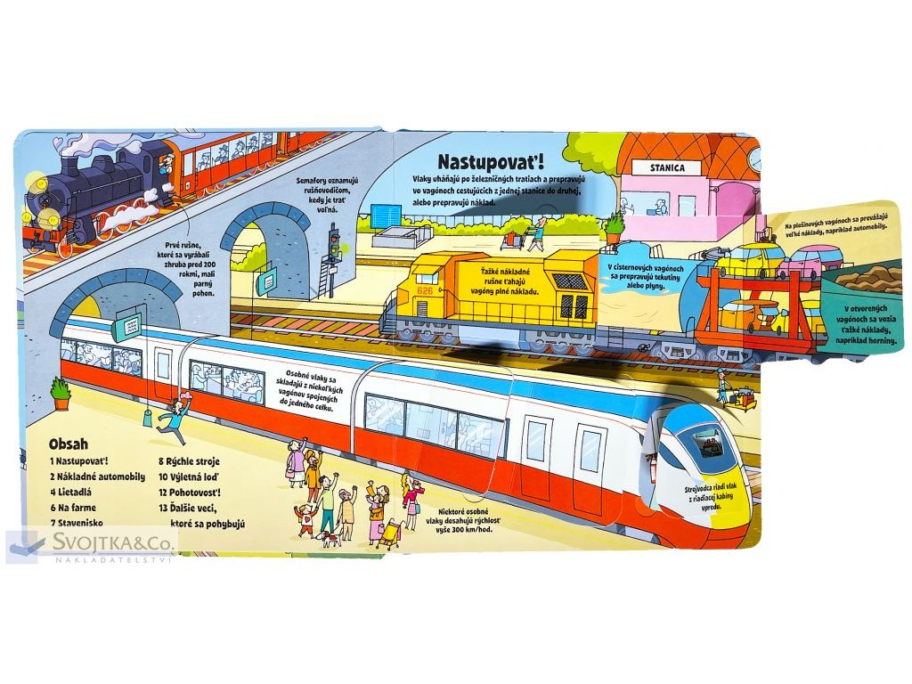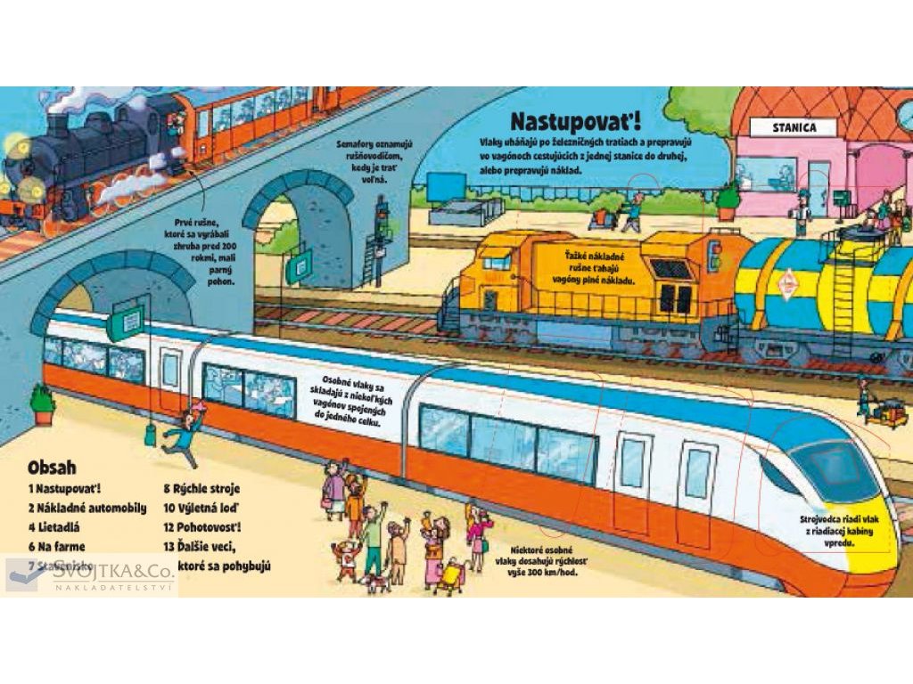 Zoznám sa s vlakmi uháňajúcimi po železničných tratiach, s nákladnými automobilmi prepravujúcimi rôzne náklady, s veľkými prúdovými dopravnými lietadlami prepravujúcimi cestujúcich po celom svete, s farmárskymi strojmi číhajúcimi na poliach, ale aj s pretekárskymi autami, obrovskými výletnými loďami, pohotovostnými vozidlami, ktoré sa ponáhľajú pomôcť ľuďom v núdzi, či so stavebnými strojmi, ktoré používajú stavbári na nerovnom teréne stavenísk. Tak rýchlo nastupovať, ideme!Dodatočné parametre