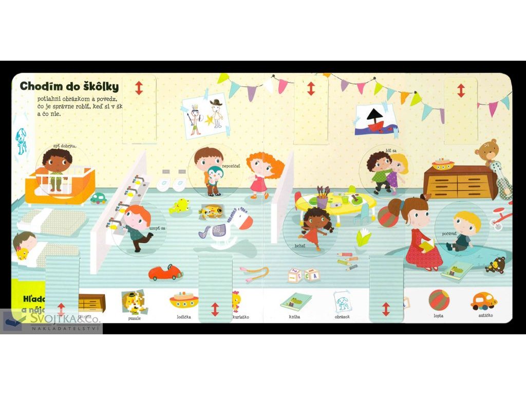 Odklápacie okienka, rozličné materiály na dotyk, vyťahovacie obrázky, otáčacie kolieska, dotykové prvky na rozvoj jemnej motoriky... Táto interaktívna knižka s veselými farebnými obrázkami je určená tým najmenším čitateľom, ktorí sa vďaka nej naučia vhodnému správaniu, urobia prvé kroky k samostatnosti a s pomocou rodičov spoznajú zábavným spôsobom každodenný život. Deti sa naučia rozoznávať rôzne časti oblečenia; dozvedia sa, ako sa vhodne správať v škôlke; zorientujú sa v rôznych častiach domu (čo sa nachádza v kuchyni a čo v kúpeľni); budú sa vedieť bezpečne pohybovať vonku, na ulici, aj v parku. Táto moderne spracovaná knižka ponúka vďaka interaktívnym prvkom oveľa viac než len obyčajný zážitok z čítania. Čakajú vás chvíle plné zábavy a poznania.Dodatočné parametre