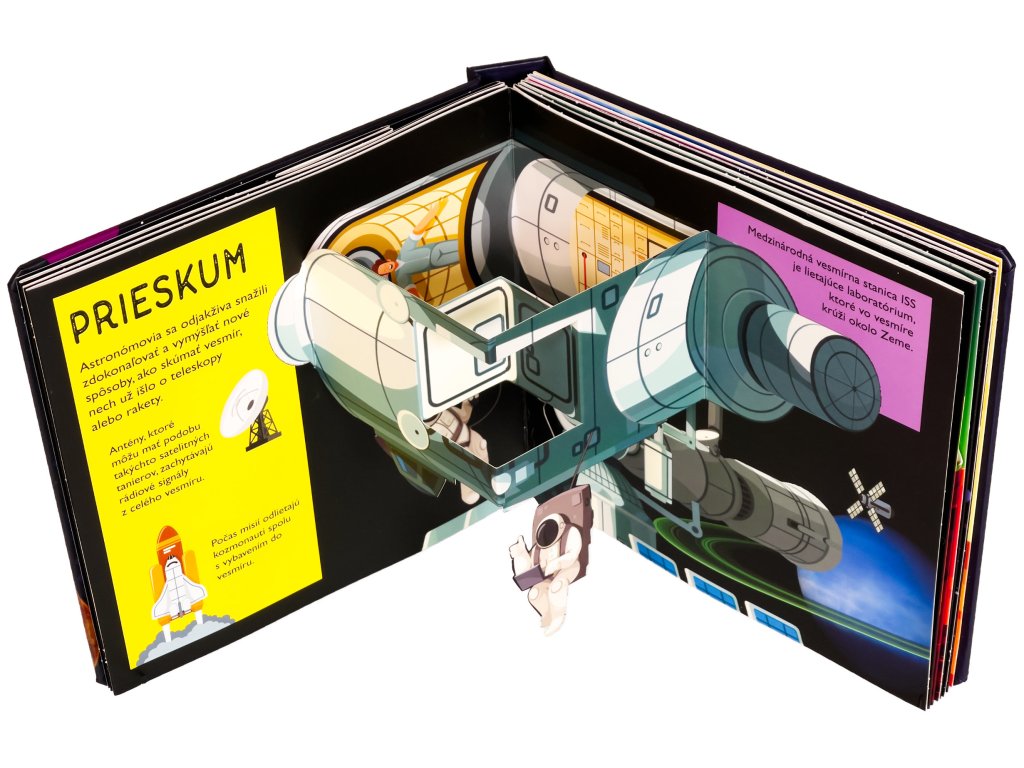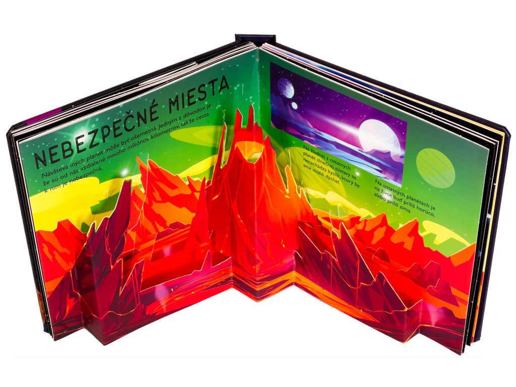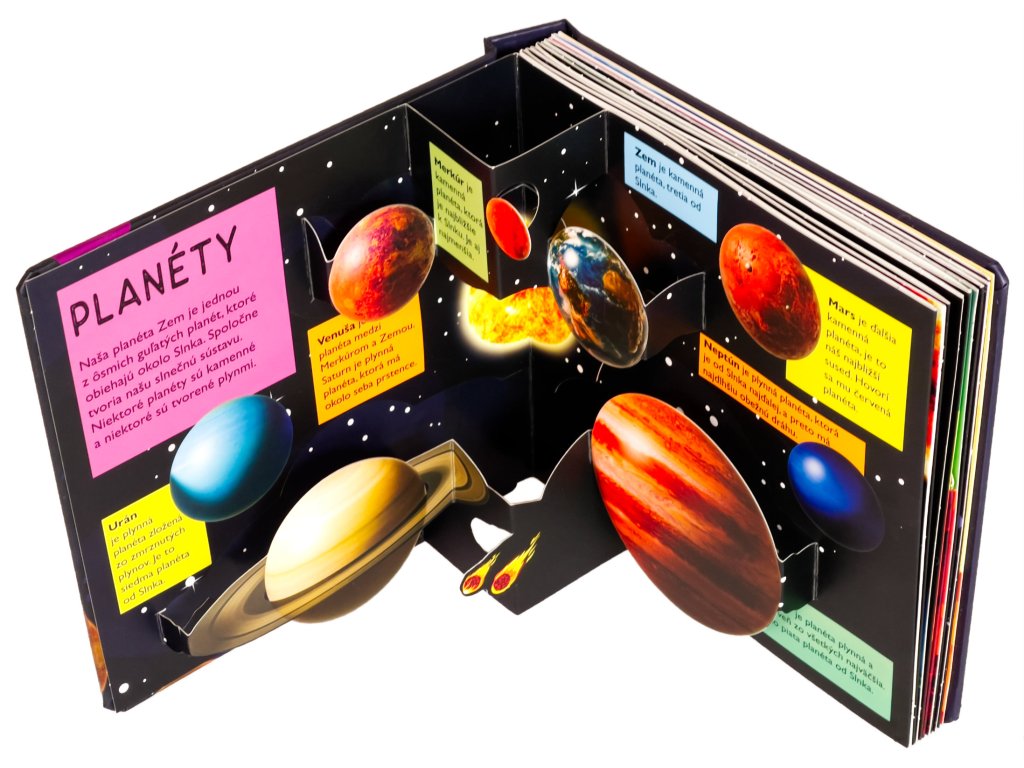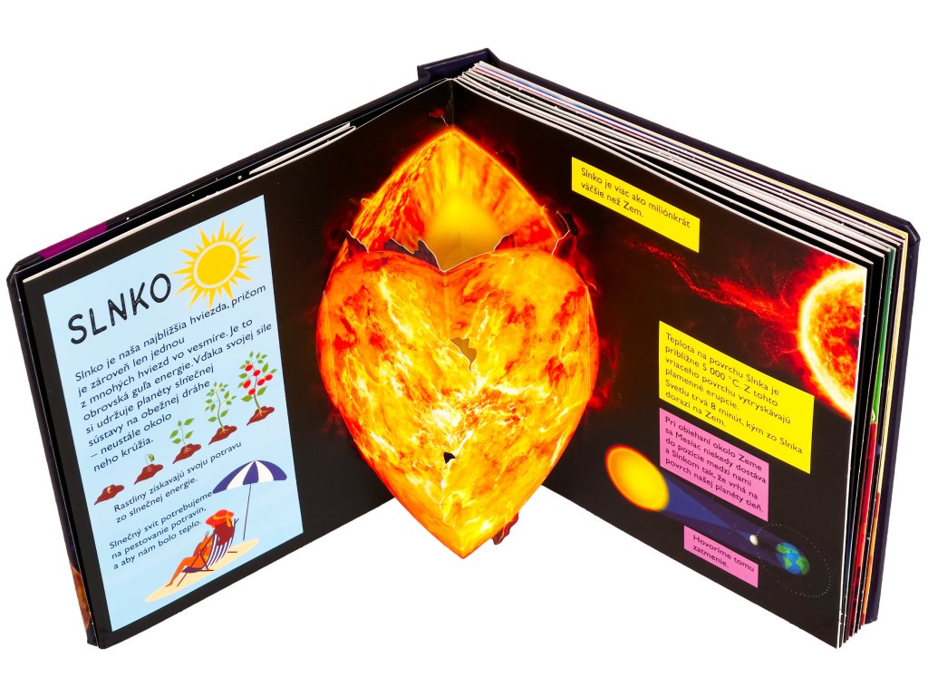Koľko planét obieha okolo Slnka? Z čoho má Saturn svoje prstence? Vieš, že Slnko je viac ako miliónkrát väčšie než Zem? Vstúp do tejto krásne ilustrovanej knihy s množstvom priestorových pop-up obrázkov a nájdeš odpovede na tieto otázky a dozvieš sa aj mnoho ďalšieho! Kniha je určená pre najmenšie deti, ktoré sa vďaka nej zoznámia s našou Slnečnou sústavou, planétami, Slnkom, Mesiacom, preskúmajú aj vesmír a spoznajú zázračnú planétu Zem. Pre malé deti sú pop-up obrázky ideálne, pretože do nich môžu doslova vstúpiť a všetko si lepšie a názorne predstaviť. Toto interaktívne a hravé spracovanie vo vašich deťoch iste vzbudí záujem a udrží pozornosť na dlhé hodiny.Dodatočné parametre