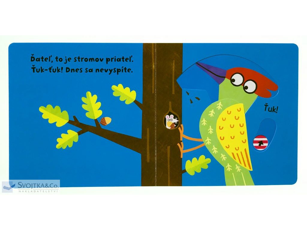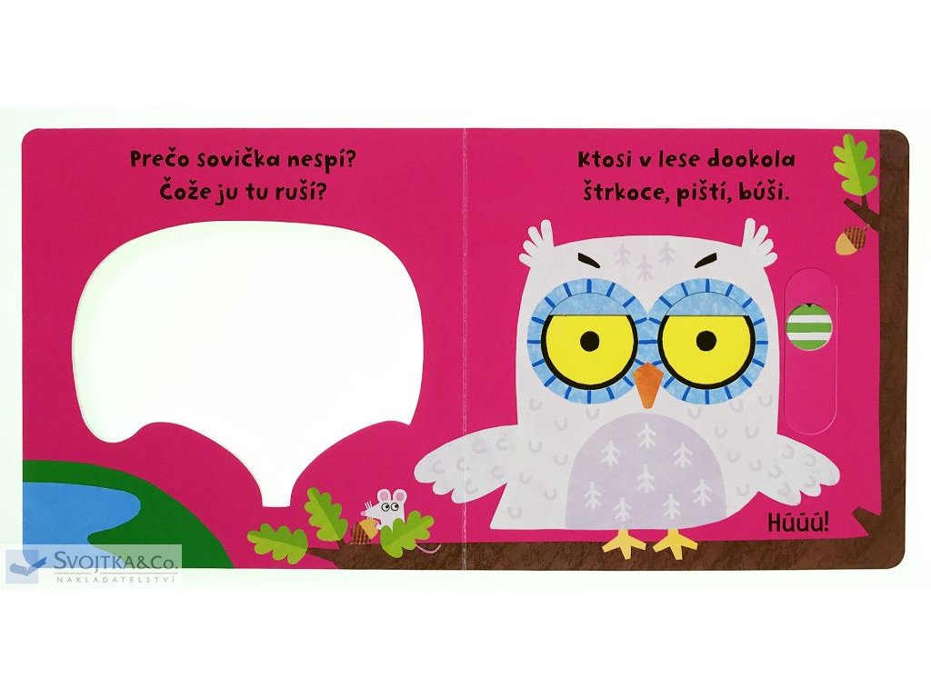 Prečo sova nemôže spať? Co všetko v lese počuje? Kdo ťuká do kmeňov stromov a ktorí šuští pod listím? A cč myška? Nebude ju sova chcieť za to pišťanie náhodou... zhltnúť? Vyskúšaj si posuvné prvky a hneď uvidíš, ako zvieratká na obrázkoch žijú. Zábavné prvé čítanie – ideálne pre batoľatá, obsahuje posuvné prvky, množstvo vtipných zvierat a hravých veršov. Táto knižka je výborná na prvé chvíle spoločného čítania a smiechu nad veselými pohyblivými obrázkami plnými zábaviek. Navyše nenásilnou formou učí deti všímať si zvuky okolo seba, nielen v prírode, a rozvíja tak ich zmyslové vnímanie.