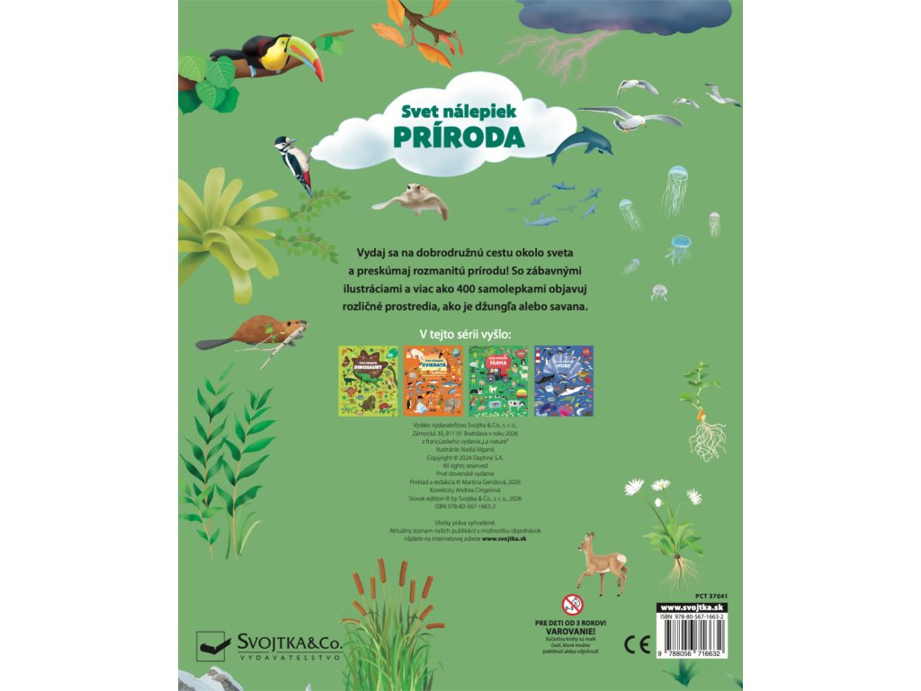Stromy, kvety, zvieratá - to všetko robí z našej planéty úžasné miesto, ktoré musíme chrániť. Na každej dvojstrane tejto knižky budeš objavovať rozličné prostredia našej planéty. Tešiť sa môžeš na džungľu, savanu, hory, oceán, polárne oblasti… A s nimi na všetok život, ktorý sa v nich nachádza. Listuj zošitom, prehliadaj si scenérie a nalep do nich viac ako 400 samolepiek! Táto samolepková knižka je ideálnou pomôckou pre deti, ktoré chcú získať základné znalosti o rozmanitom prostredí a fungovaní našej planéty. Zábavné učenie môže začať! Nalep na stránky samolepky a spoznaj rozmanitú prírodu.Dodatočné parametre