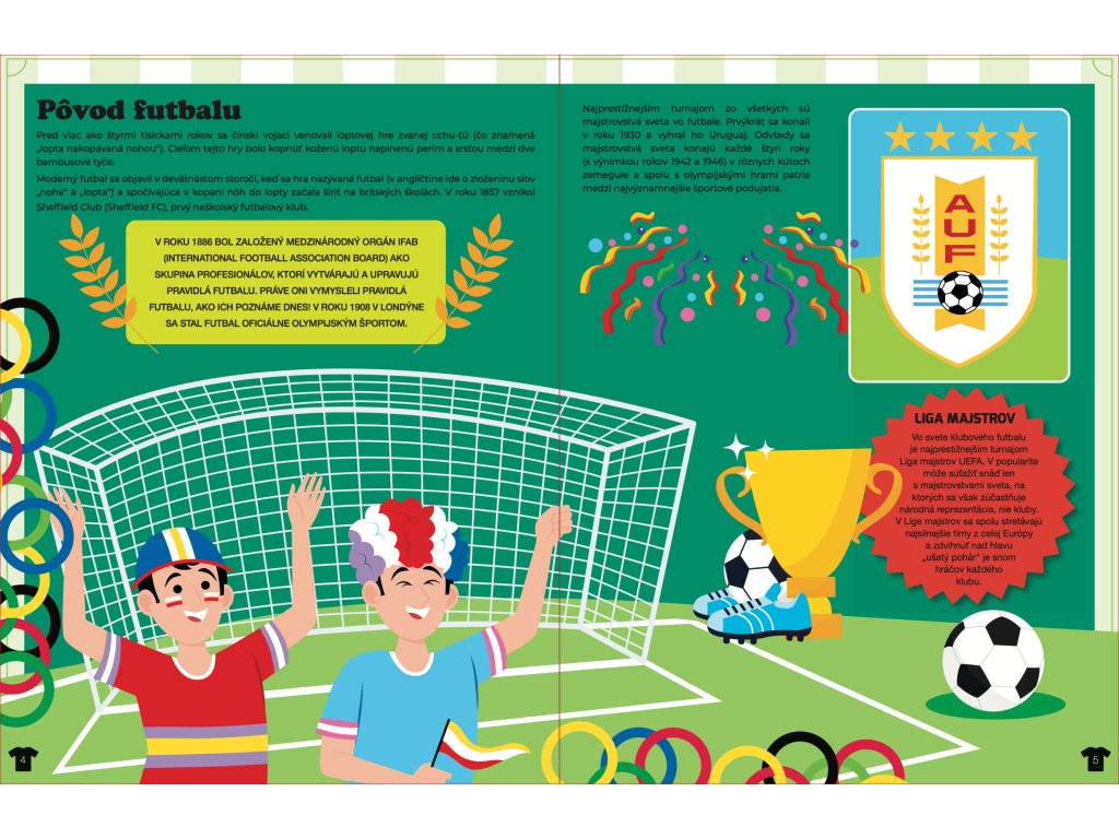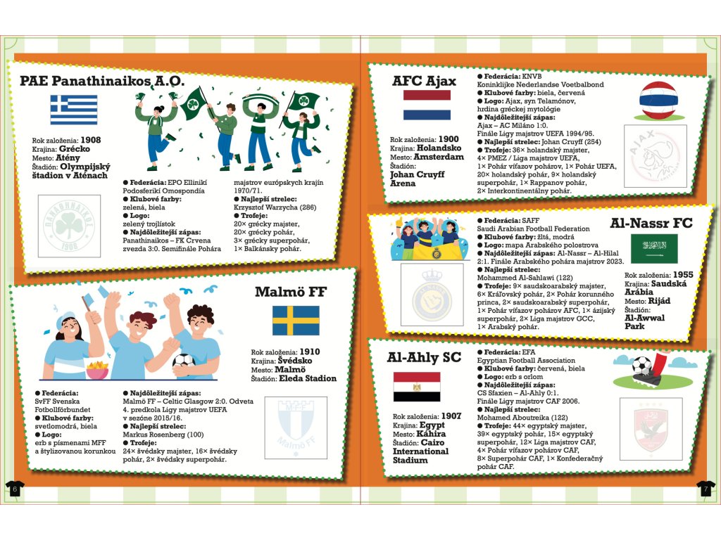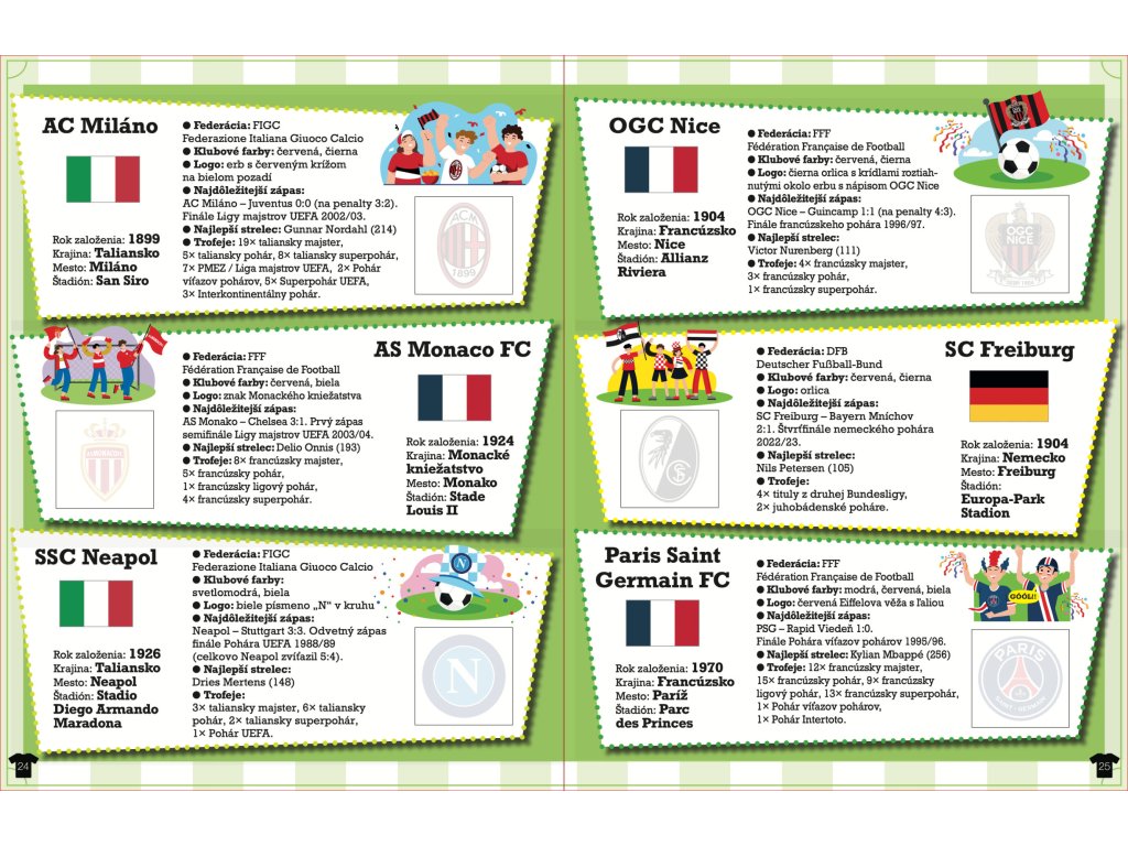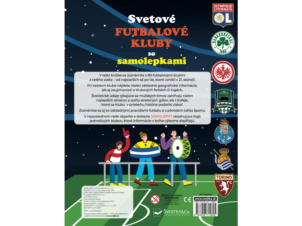 V tejto knižke sa zoznámite s 80 futbalovými klubmi z celého sveta - od najstarších až po tie, ktoré vznikli v 21. storočí. Pri každom klube nájdete nielen základné geografické informácie, ale aj zaujímavosti o klubových farbách či logách. Štatistické údaje týkajúce sa mužských tímov zahŕňajú nielen najlepších strelcov a počty strelených gólov, ale i trofeje, ktoré sa klubu v priebehu histórie podarilo získať. Zoznámite sa aj so základnými pravidlami futbalu a s pôvodom tohto športu. V neposlednom rade objavíte a dolepíte SAMOLEPKY obsahujúce logá jednotlivých klubov, ktoré informácie v knihe výborne dopĺňajú.Dodatočné parametre
