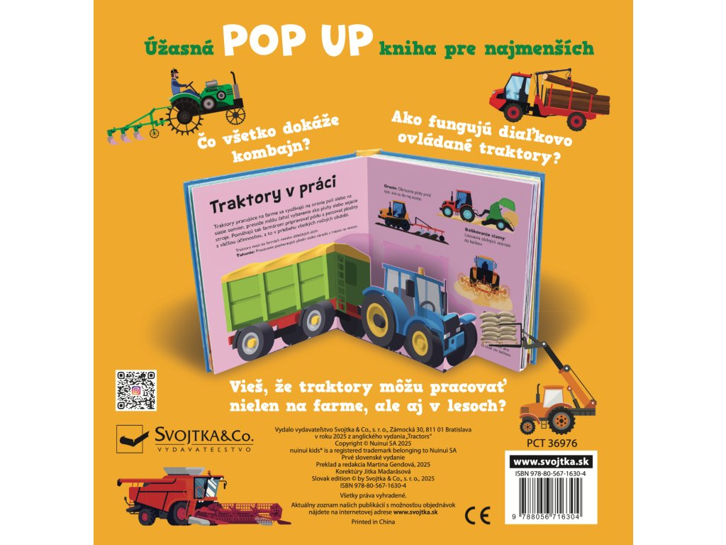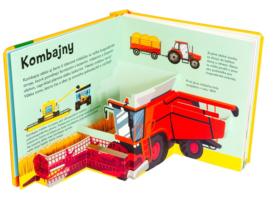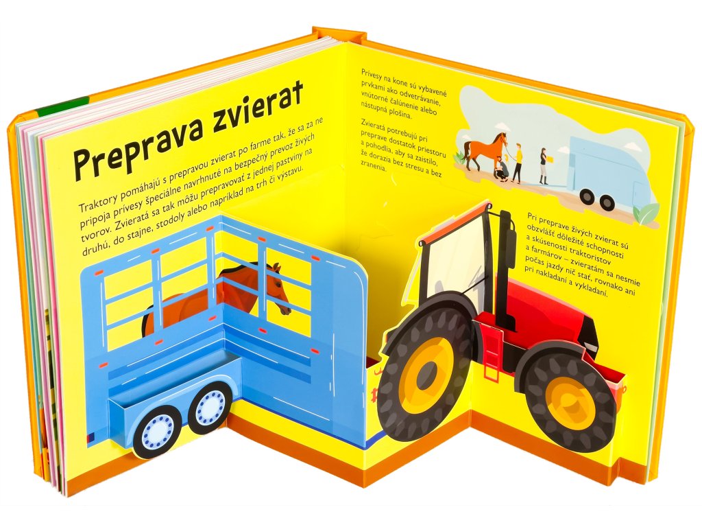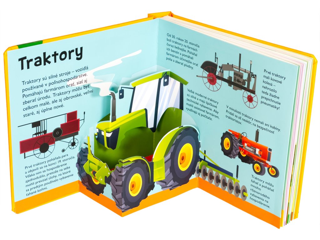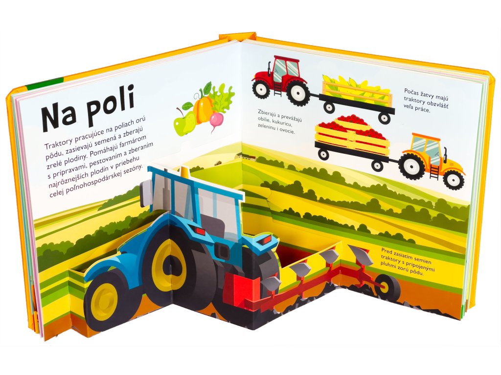 Vieš, čo všetko dokáže traktor, kde všade môže pracovať a ako vyzerá kombajn alebo vysokozdvižný vozík? Vstúp do tejto krásne ilustrovanej knihy s množstvom priestorových pop-up obrázkov a nájdeš odpovede na tieto otázky a dozvieš sa aj mnoho ďalšieho! Kniha je určená pre najmenšie deti, ktoré sa vďaka nej zoznámia s rôznymi druhmi traktorov, ich výbavou, prácou na farme, v lese alebo na stavbe. Pre malé deti sú pop-up obrázky ideálne - môžu do nich doslova vstúpiť a všetko si predstaviť názornejšie a zábavnejšie. Interaktívne a hravé spracovanie určite vzbudí u vašich detí záujem a udrží ich pozornosť na dlhé hodiny.Dodatočné parametre